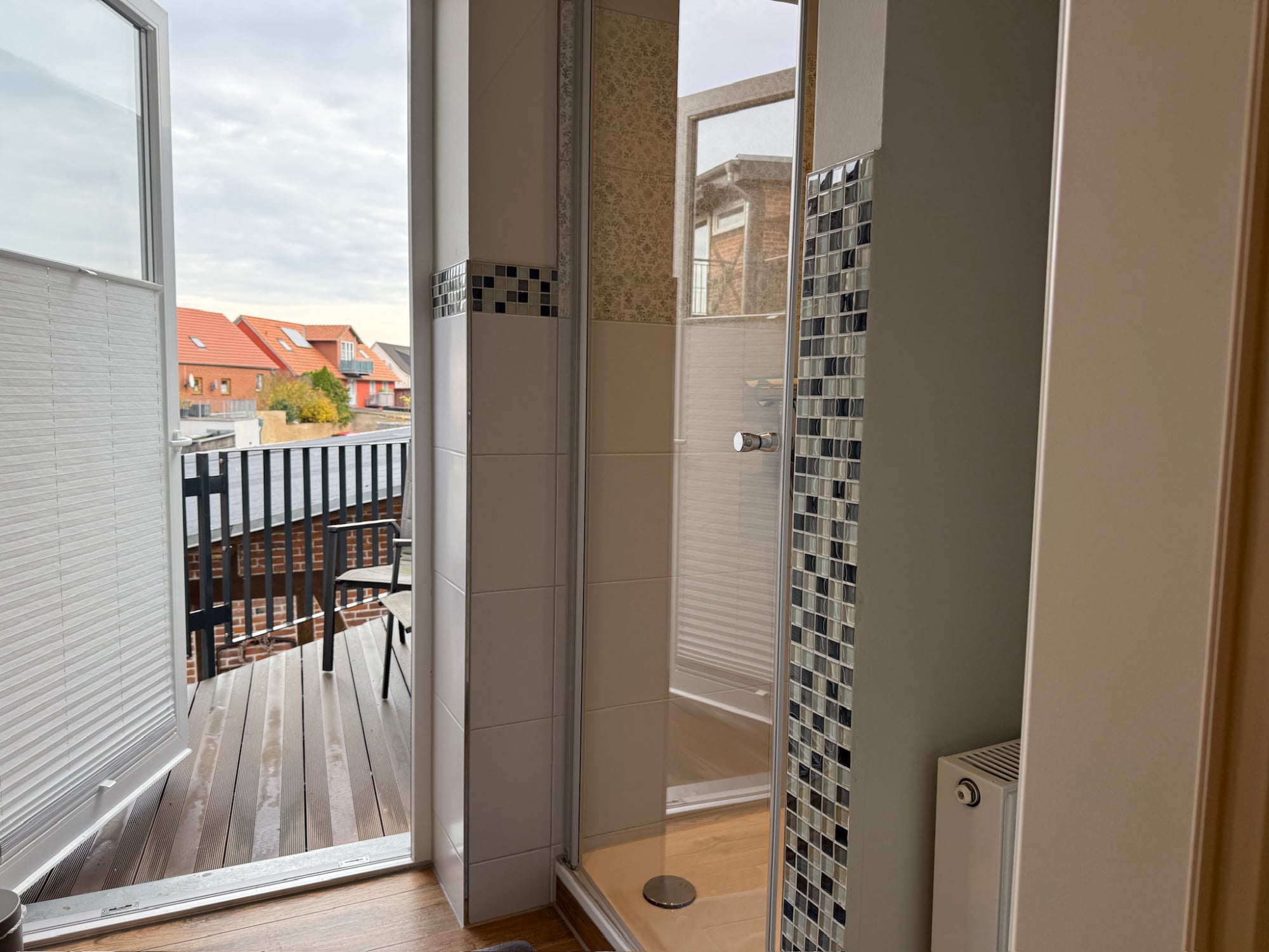 - Bad mit WC, Dusche, Waschtisch und Spiegel mit Zugang zum Balkon mit Blick in den schönen Innenhof mit Sitzgelegenheit & Tisch für 2 Personen