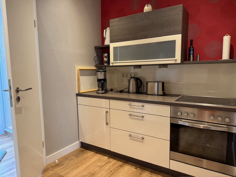 - voll ausgestattete Küche, Kühlschrank mit Kühlfach, Ceran-Kochfeld, Backofen, Geschirrspüler, Kaffeemaschine, Wasserkocher, Toaster