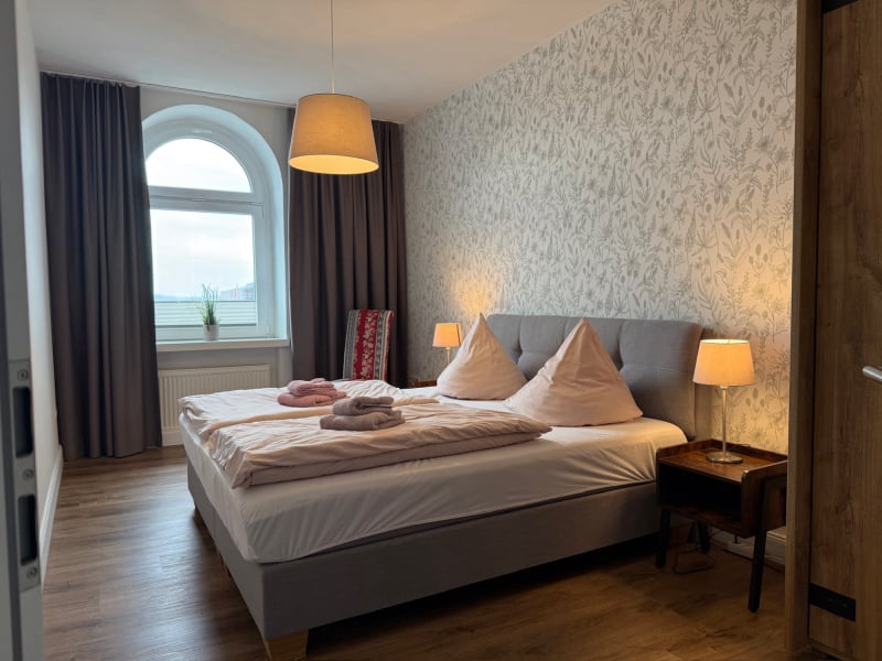 - 1 Schlafzimmer mit Hafenblick mit Doppelbett 180x200 cm und großem Kleiderschrank
