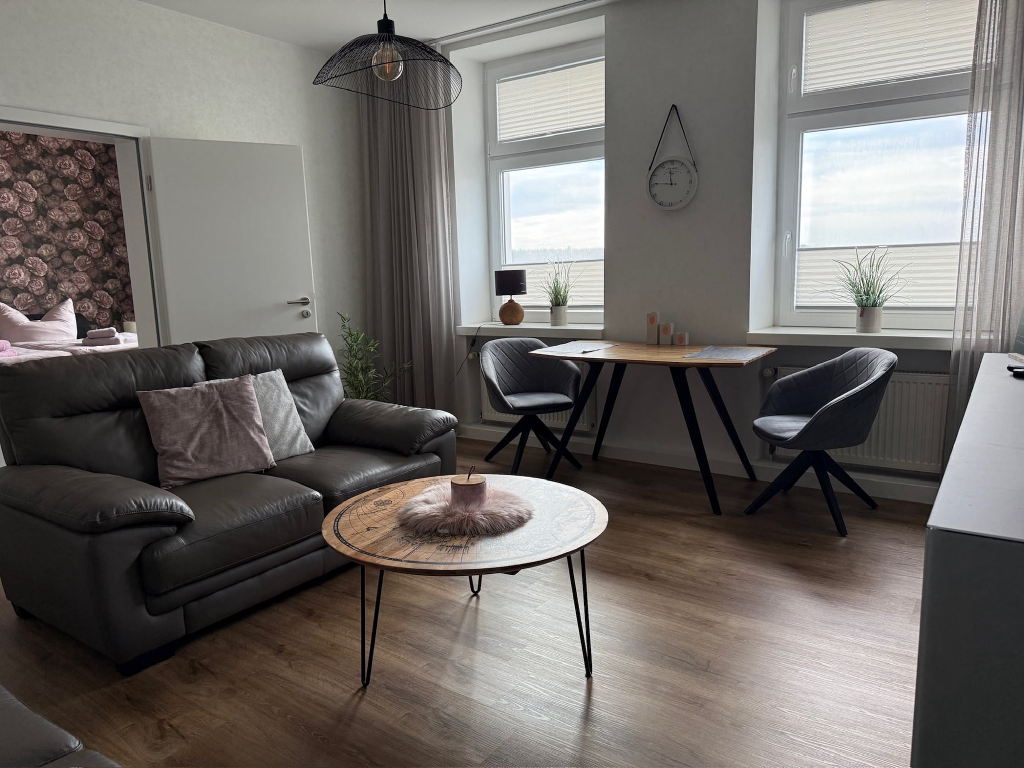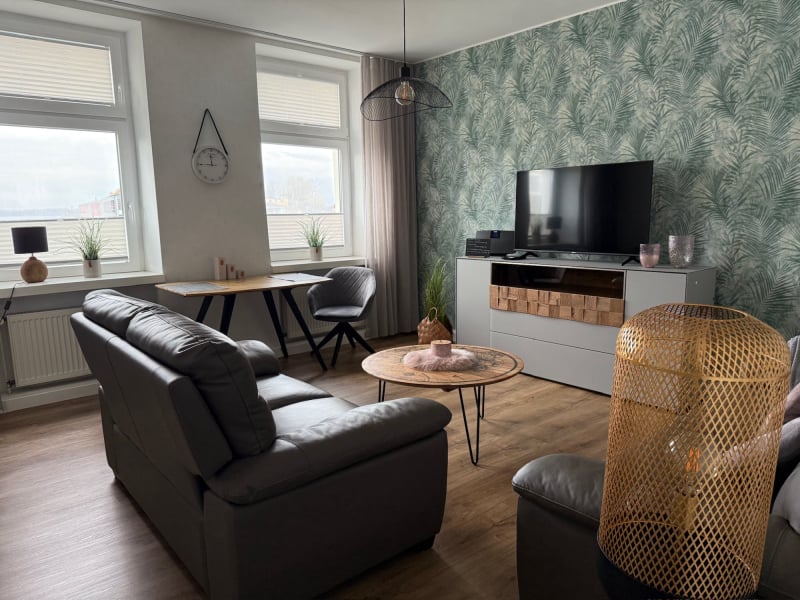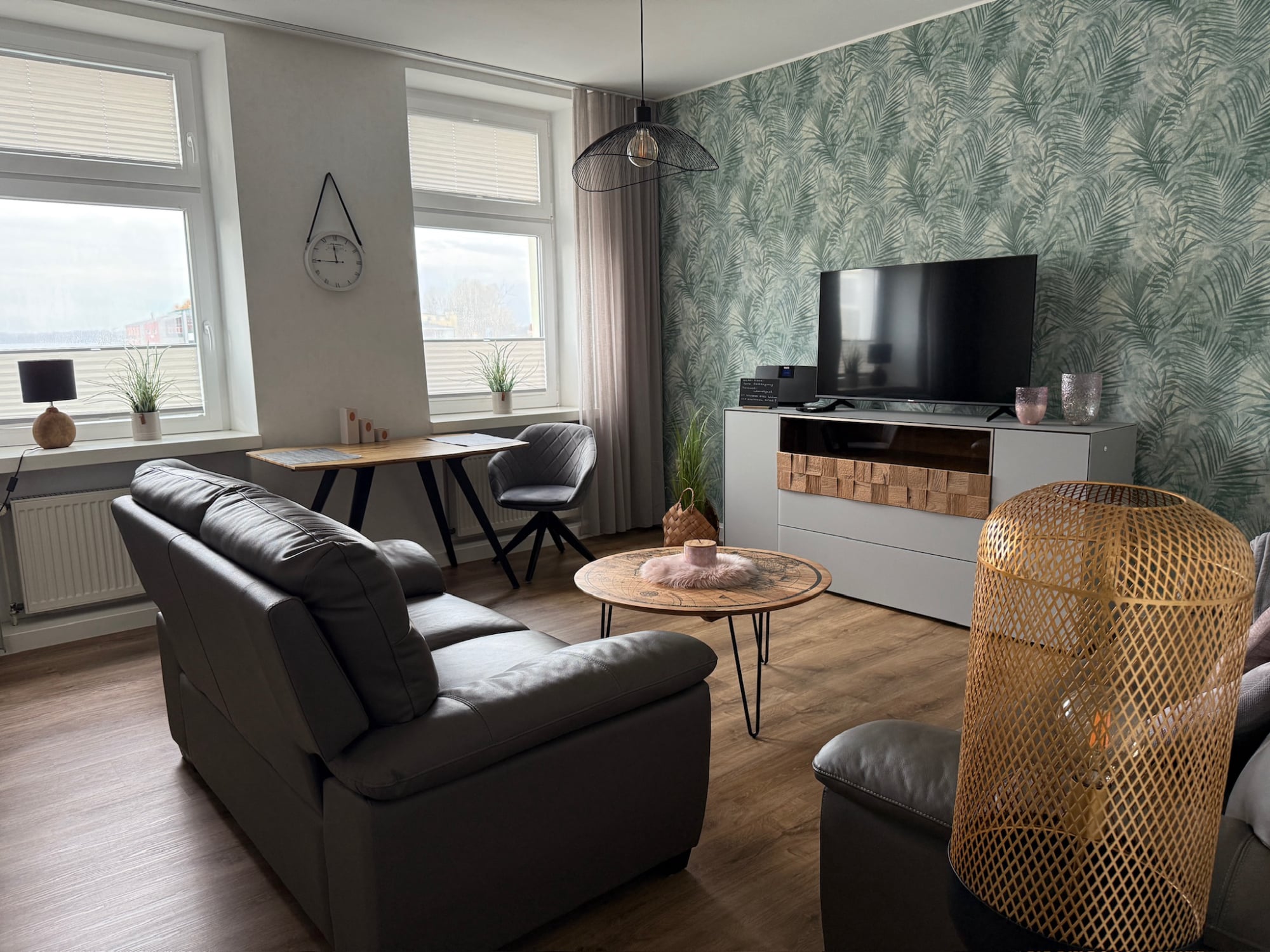 - 1 Wohnzimmer mit TV, Couch (2 Zweisitzer) sowie Esstisch für 2 Personen mit Hafenblick