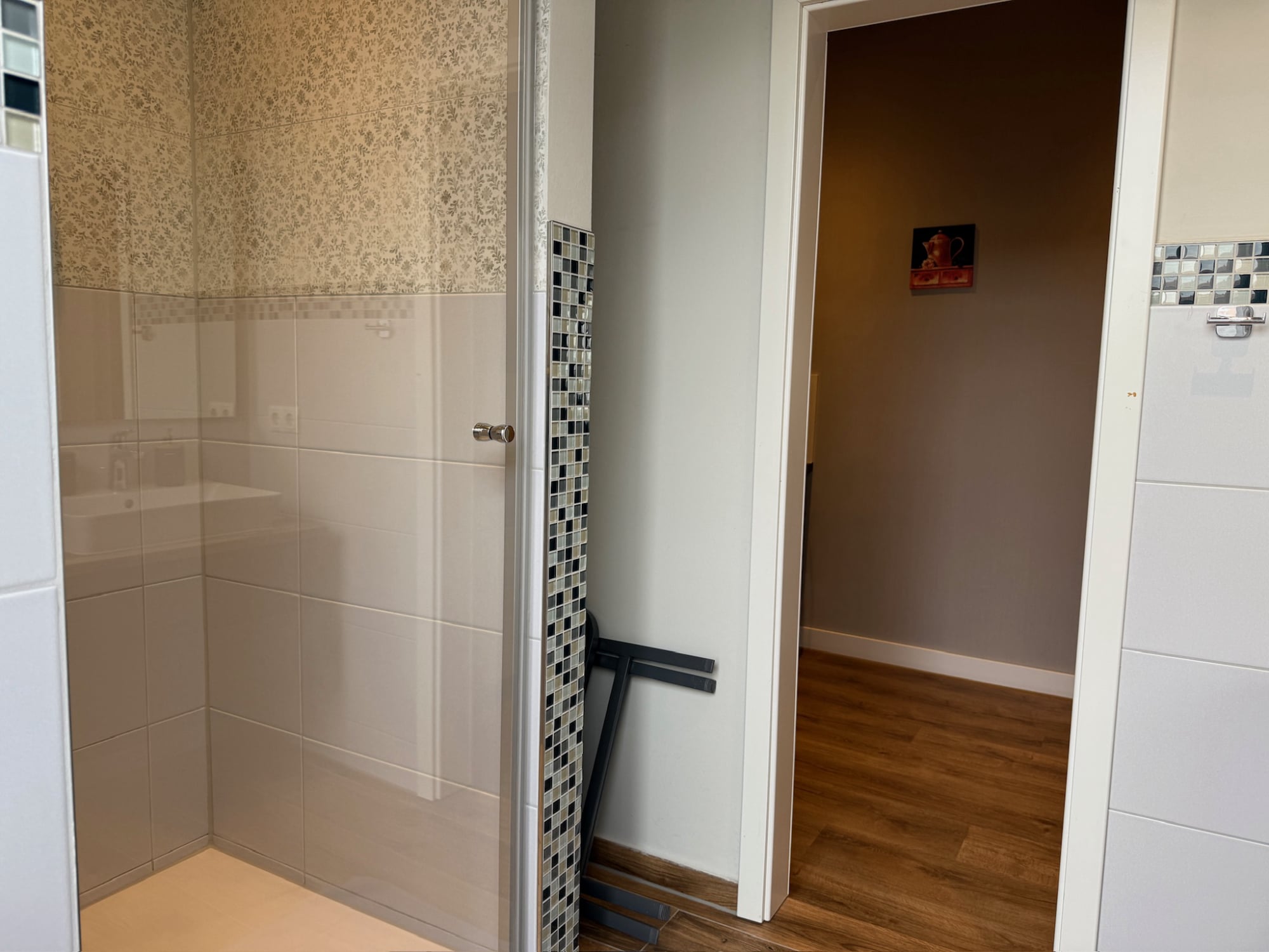 - Bad mit WC, Dusche, Waschtisch und Spiegel mit Zugang zum Balkon mit Blick in den schönen Innenhof mit Sitzgelegenheit & Tisch für 2 Personen