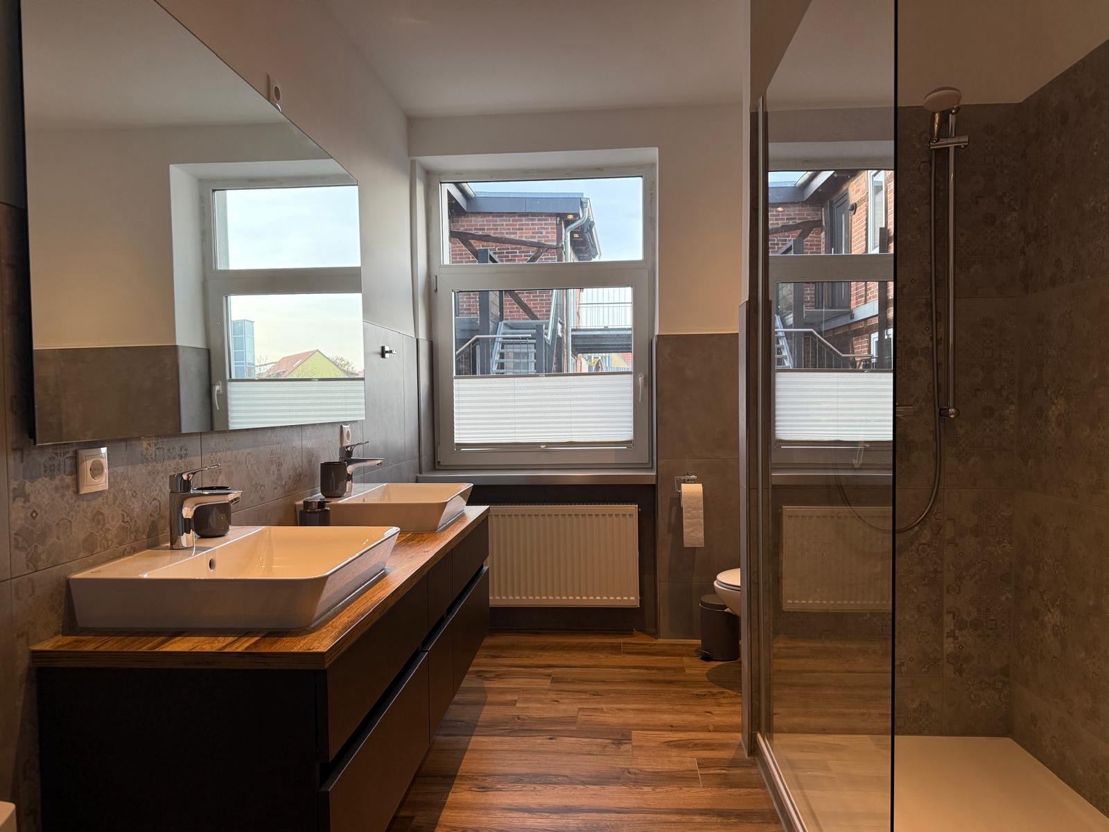 - Bad mit WC, Dusche und Doppel- Waschtisch und Spiegel